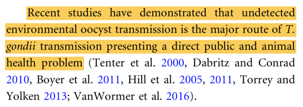 The title of our new paper, in EcoHealth, is actually “The One Health Approach to Toxoplasmosis: Epidemiology, Control, and Prevention Strategies” but it is really about taking the control of the intracellular parasite that causes the disease toxoplasmosis seriously. The paper is an interdisciplinary effort that came out of a meeting organized by Grant Sizemore at American Bird Conservancy and led by A. Alonso Aguirre at George Mason University.
