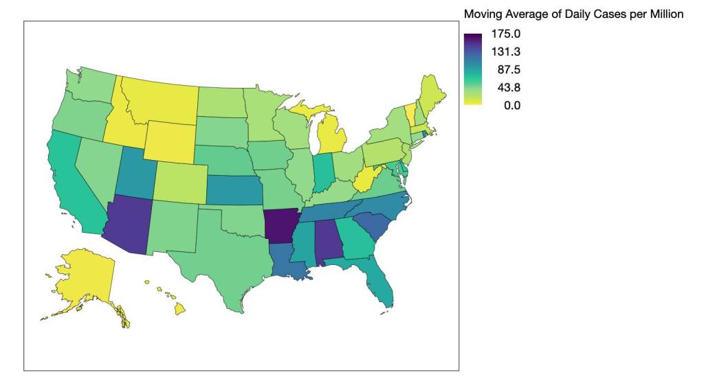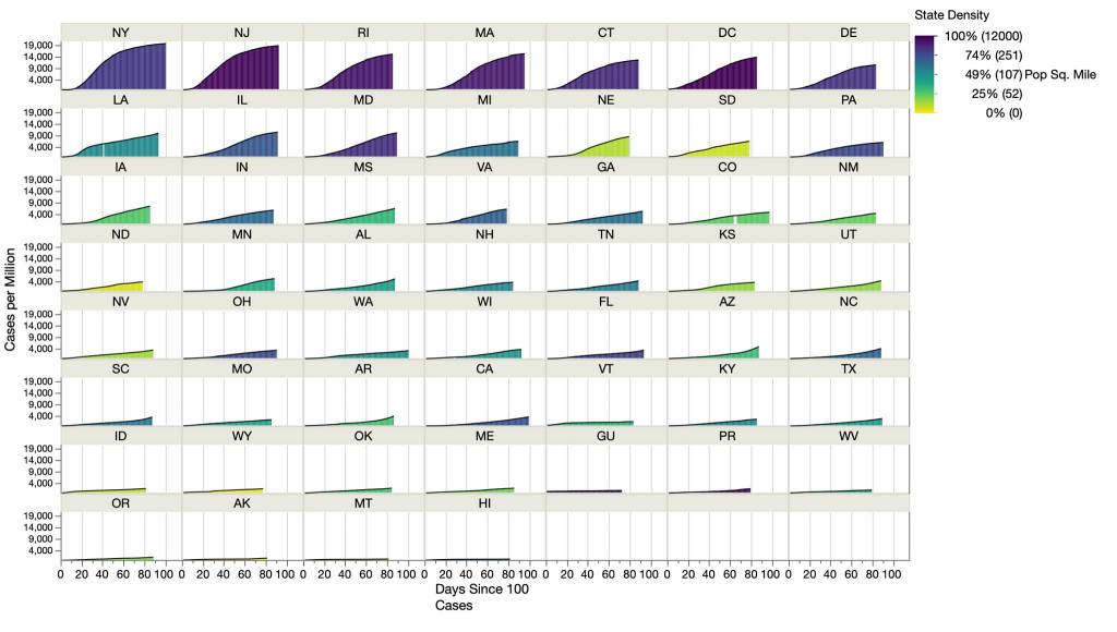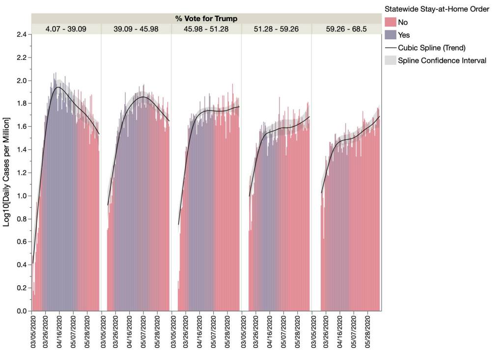 The top three quintiles of states by vote Republican for president in 2017 now each have an average daily case rates for covid-19 than the bottom two quintiles. It is in their courts now to see how they manage things and stack up to Cuomo. I’d say Newsom (CA) too, but we do not have things under control here and have not seen the sustained declines in daily new cases per capita that New York has achieved. Arizona, Arkansas, Alabama it is your turn to show some leadership.