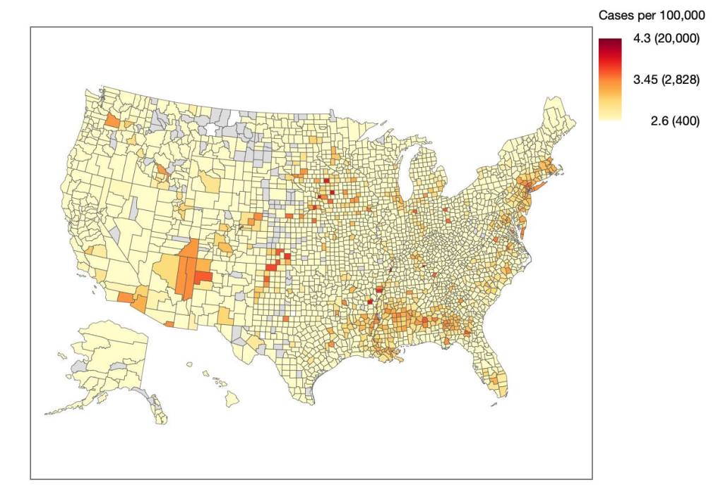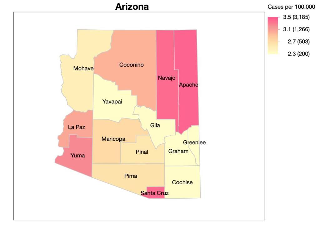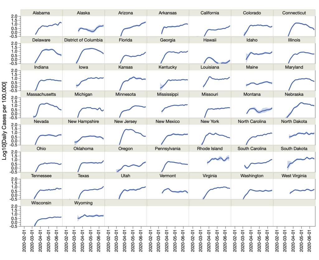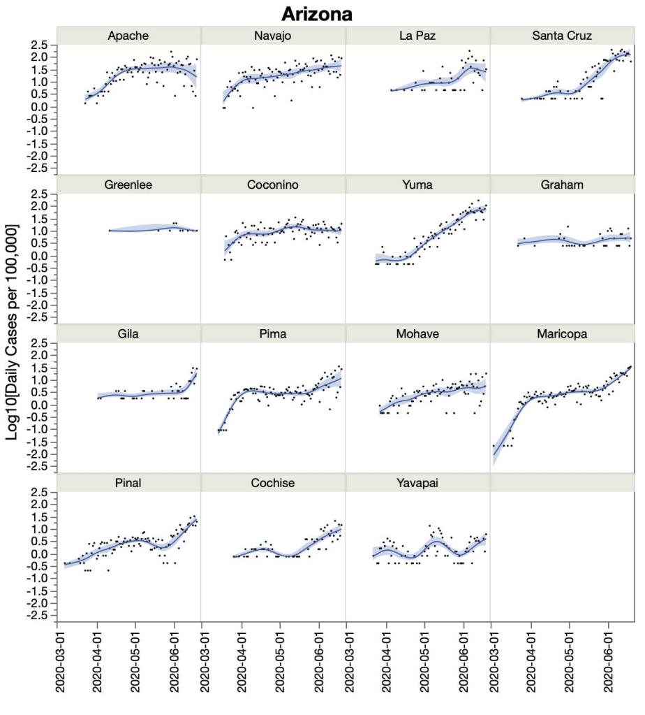 Arizona has some interesting patterns; Maricopa County (Phoenix) has taken a distinct upward jump in new daily cases over the past few weeks, as have most other counties, except counties with Indian Nations that were hit earlier on.