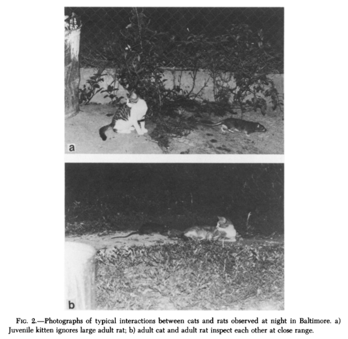 Subsequent research in Baltimore in 1986 found that the rats killed by cats were juvenile or subadult (<200 g). Adult rats were never attacked by cats and the author observed that “generally these species coexist peacefully in alleys.”