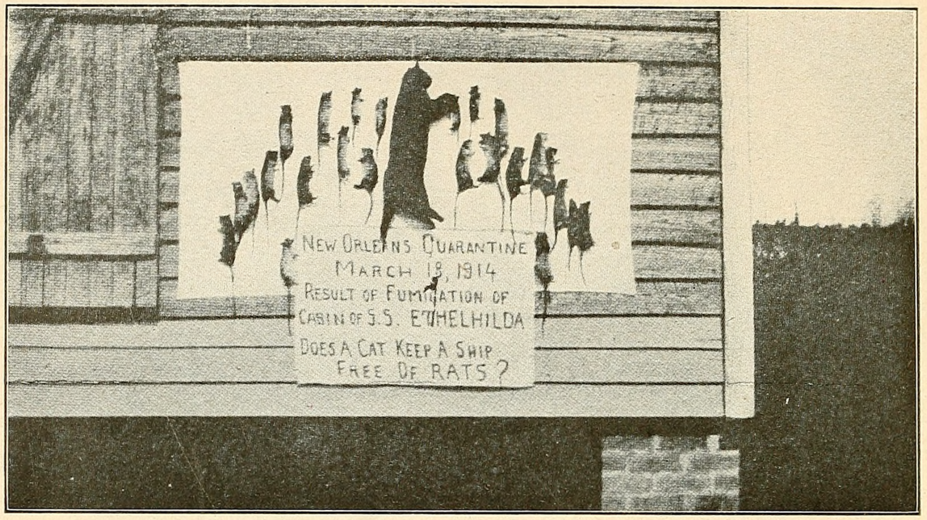 The US Public Health Service used to fumigate ships for rats, because rats do in fact harbor fleas that carry nasty diseases like plague. In the early years of the 1900s quarantine officers would routinely get pushback from captains that their ship need not be fumigated because they had cats aboard that were excellent ratters and that there would be no rats to be found. Such was the case with the captain of the British steamship SS Ethelhilda, arriving in New Orleans from Africa on March 18, 1914. The captain insisted there would be no rats, due to the services of “an exceptionally good cat.” The quarantine officer insisted on fumigation anyway and the captain forgot to remove the cat ahead of time. The following picture is the result.