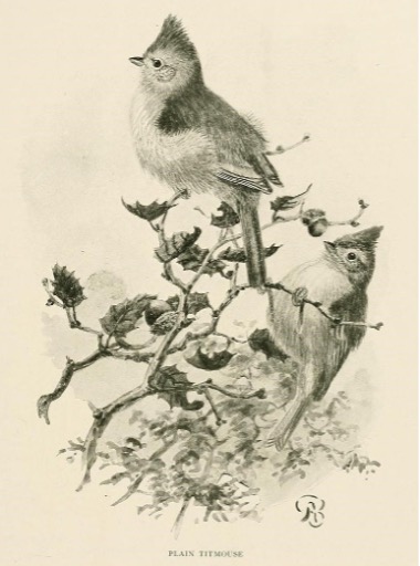 They typically roost in cavities in trees or in dense foliage that feels like a cavity. They also nest in cavities or will use nest boxes designed for smaller birds. We have such a box on our house under a large oak. The spring is marked by the titmice spending more time around the box, then becoming scarcer for two weeks during incubation. Soon, however, both the male and female are making nearly constant trips to the box to feed their young. They can lay three to nine eggs and we’ve typically seen four or five fledglings. The nestlings at first can barely be heard as faint high-pitched squeaking during each food delivery but then louder and lower squeaks as they grow and finally fledge. To stand near the nest box and hear the begging of the nestlings each time a parent arrives with food is a treat.