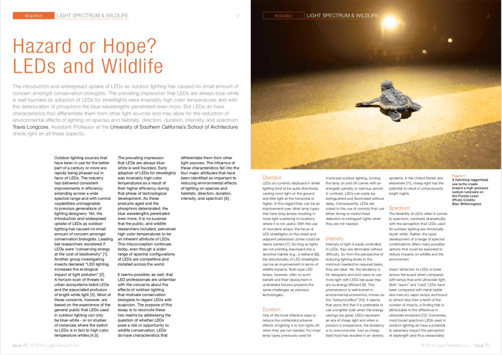 Longcore, T. 2018. Hazard or hope? LEDs and wildlife. LED Professional Review 70:52–57.